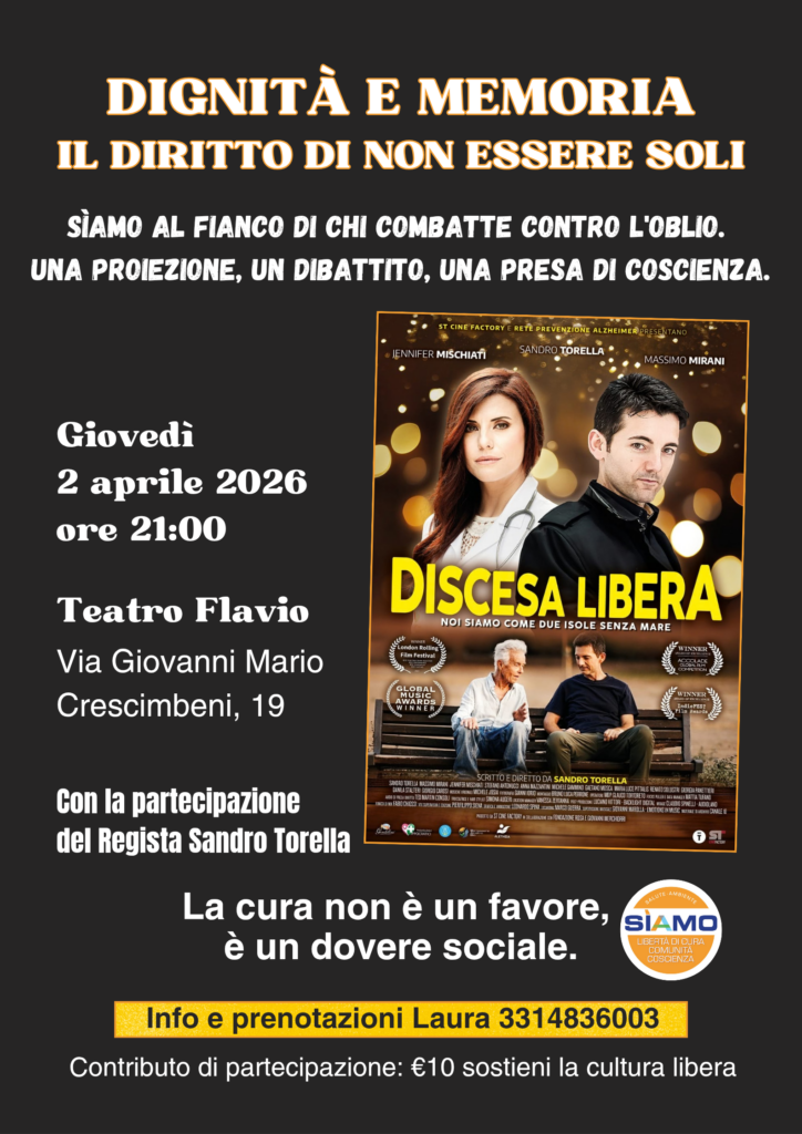 L’Alzheimer non è solo una patologia medica, è una sfida sociale che mette a nudo le carenze di un sistema che troppo spesso abbandona le famiglie al loro destino. Il 2 Aprile 2026 alle ore 21:00, presso il Teatro Flavio di Roma, il movimento SìAMO invita la cittadinanza alla proiezione del film “Discesa Libera”.